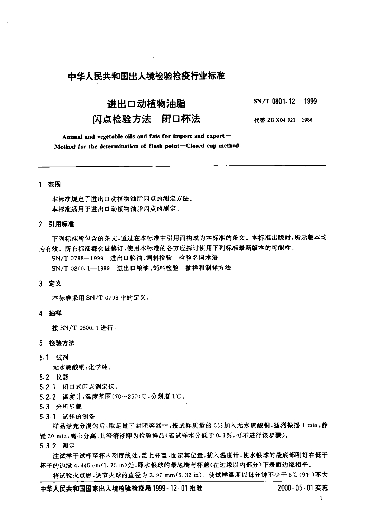 SN/T 0801.12-1999 进出口动植物油脂闪点检验方法 闭口杯法