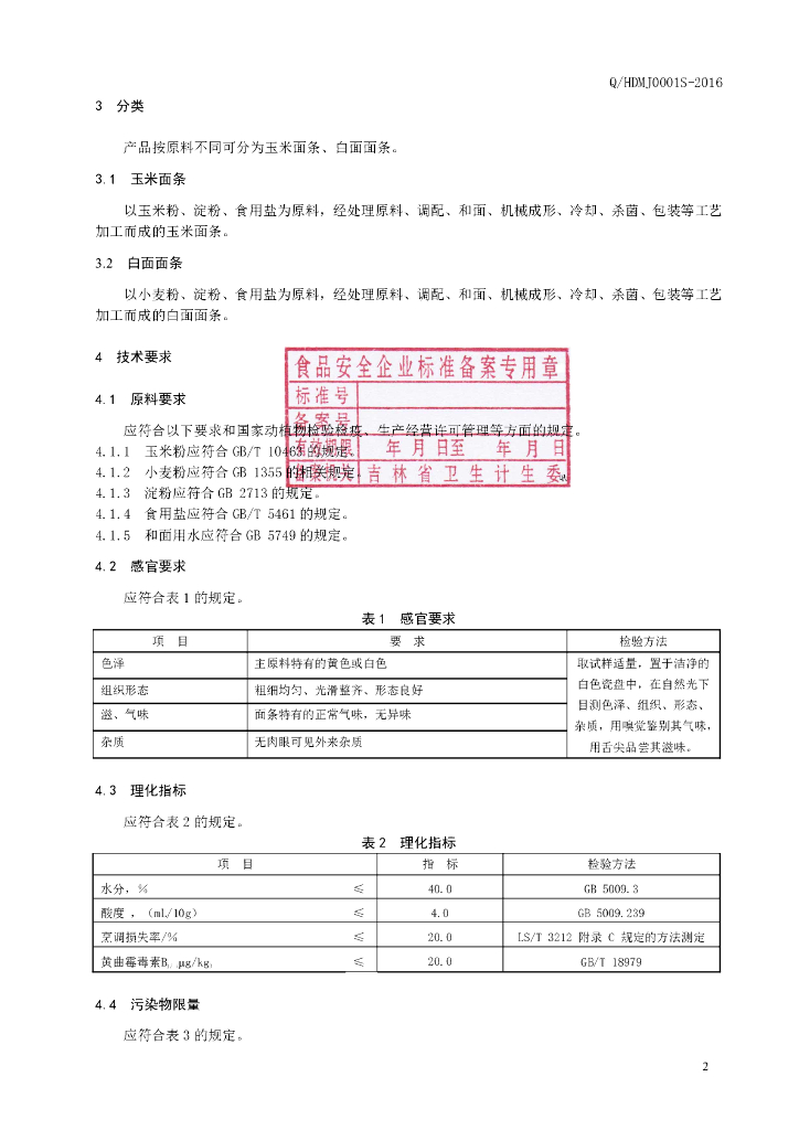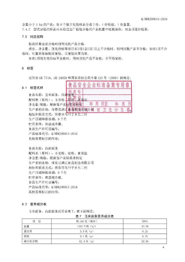 Q/HDMJ 0001S-2016 珲春豆满江食品制造有限公司 面条