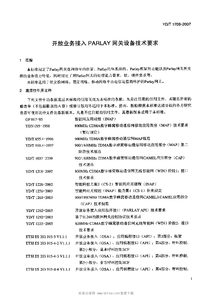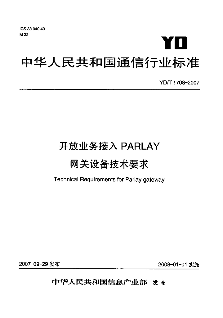 YD/T 1708-2007 开放业务接入 PARLAY 网关设备技术要求