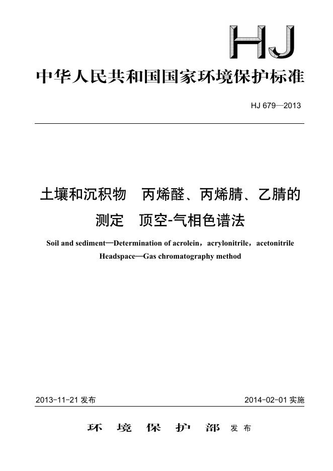HJ 679-2013 土壤和沉积物 丙烯醛、丙烯腈、乙腈的测定 顶空-气相色谱法