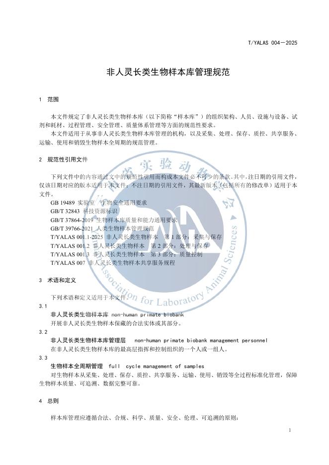 T/YALAS 004-2025 非人灵长类生物样本库管理规范