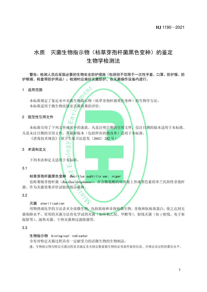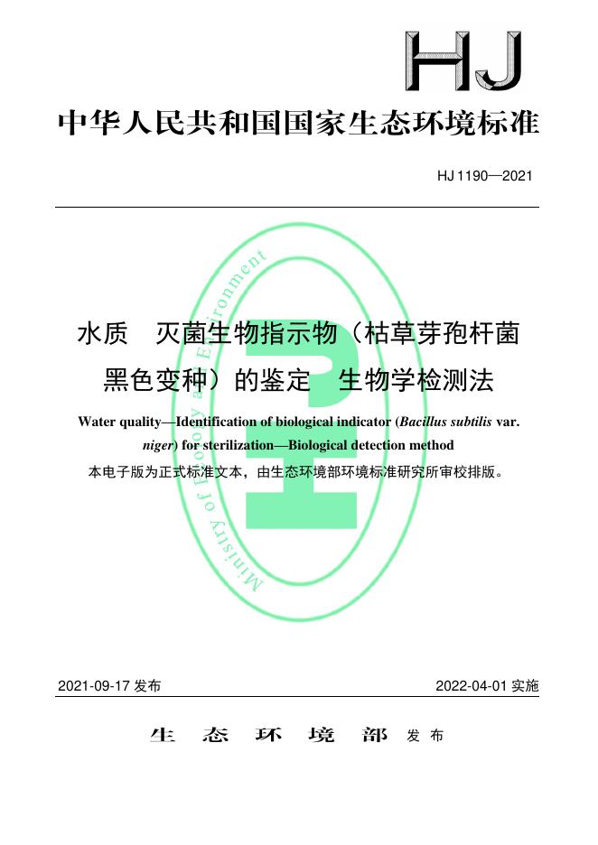 HJ 1190-2021 水质 灭菌生物指示物(枯草芽孢杆菌黑色变种)的鉴定 生物学检测法