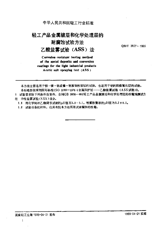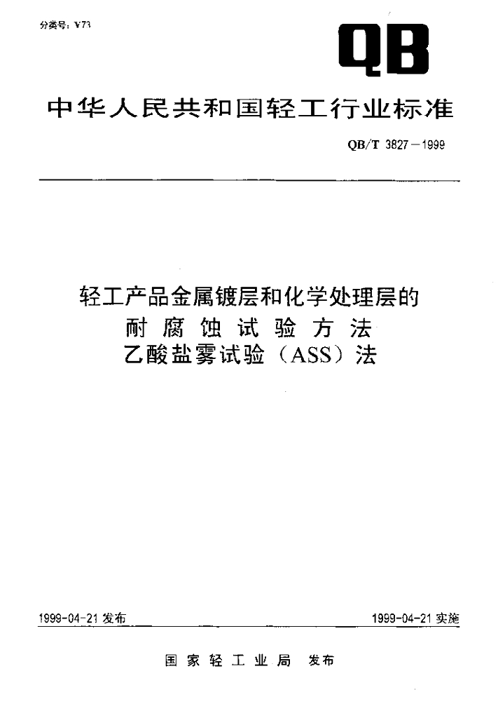 QB/T 3827-1999 轻工产品金属镀层和化学处理层的耐腐蚀试验方法乙酸盐雾试验(ASS)法