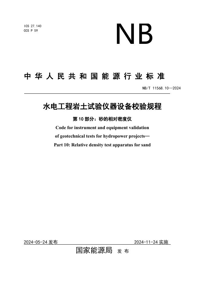 NB/T 11568.10-2024 水电工程岩土试验仪器设备校验规程 第10部分:砂的相对密度仪