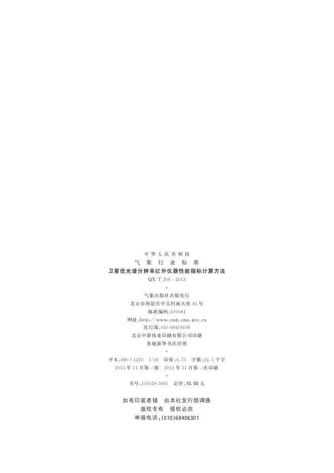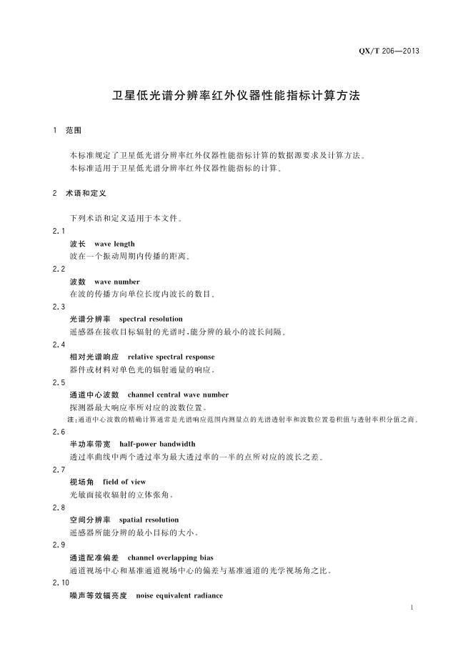 QX/T 206-2013 卫星低光谱分辨率红外仪器性能指标计算方法