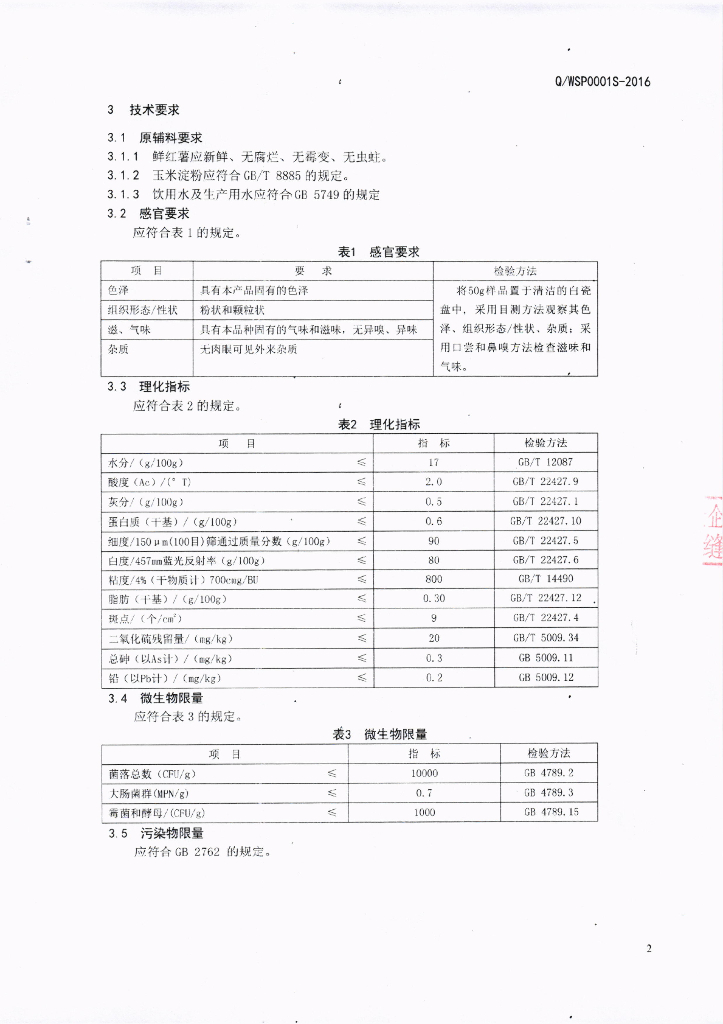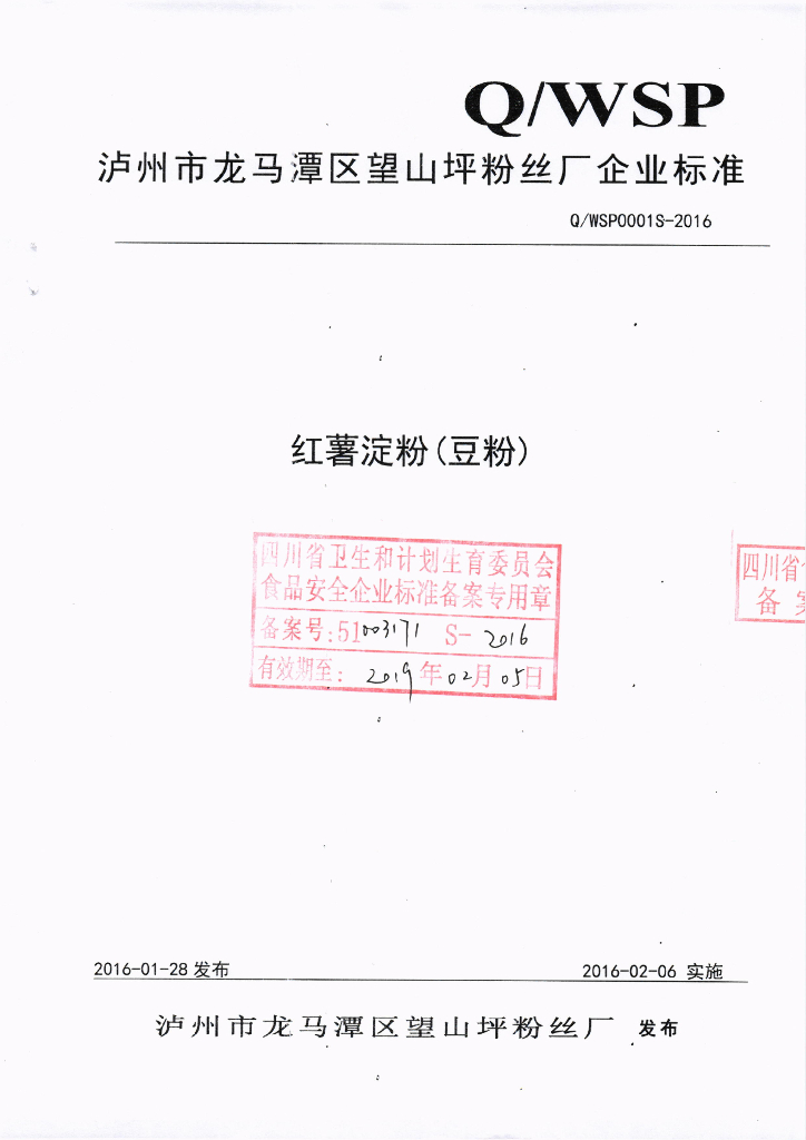 Q/WSP 0001S-2016 泸州市龙马潭区望山坪粉丝厂 红薯淀粉(豆粉)