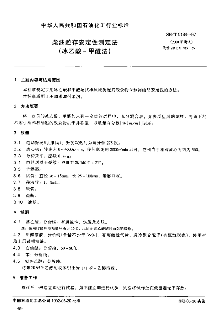 SH/T 0184-1992 柴油贮存安定性测定法(冰乙酸-甲醛法)
