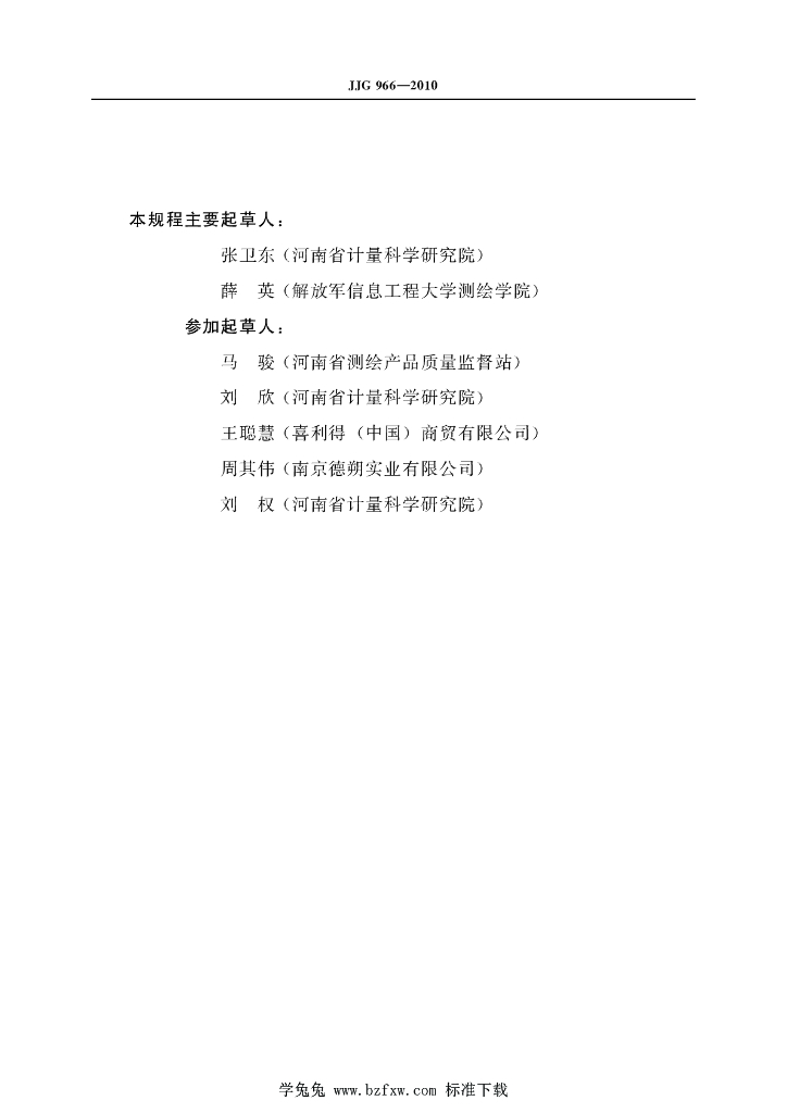 张卫东(河南省计量科学研究院)、薛英(解放军信息工程大学测绘学院)、马骏(河南省测绘产品质量监督站)、刘欣(河南省计量科学研究院)、王聪慧(喜利得(中国)商贸有限公司)、周其伟(南京德朔实业有限公司)、刘权(河南省计量科学研究院)