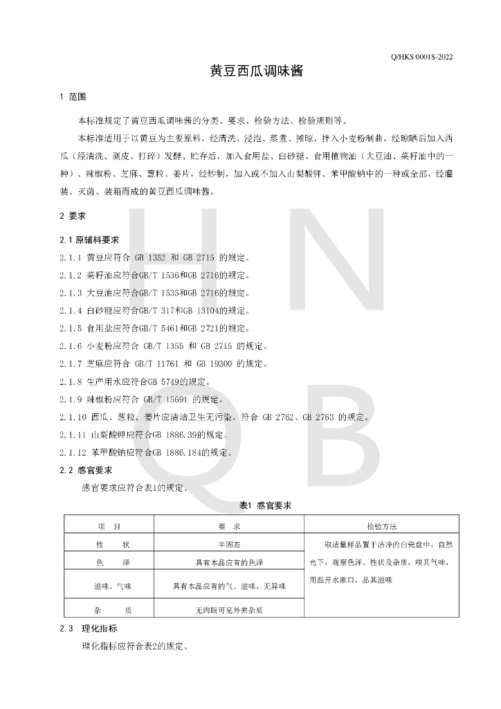 Q/HKS 0001S-2022 黄豆西瓜调味酱