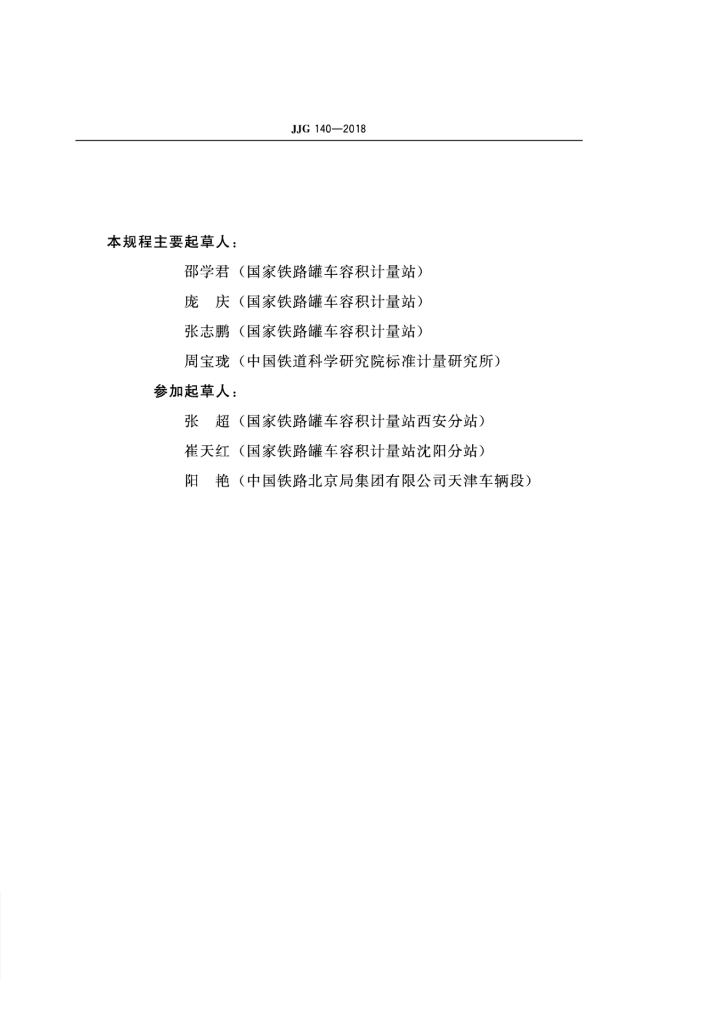 邵学君(国家铁路罐车容积计量站)、庞庆(国家铁路罐车容积计量站)、张志鹏(国家铁路罐车容积计量站)、周宝珑(中国铁道科学研究院标准计量研究所)、张超(国家铁路罐车容积计量站西安分站)、崔天红(国家铁路罐车容积计量站沈阳分站)、阳艳(中国铁路北京局集团有限公司天津车辆段)