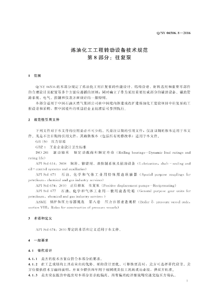 Q/SY 06506.8-2016 炼油化工工程转动设备技术规范 第8部分:往复泵