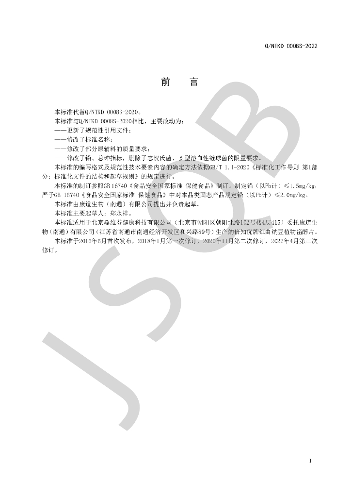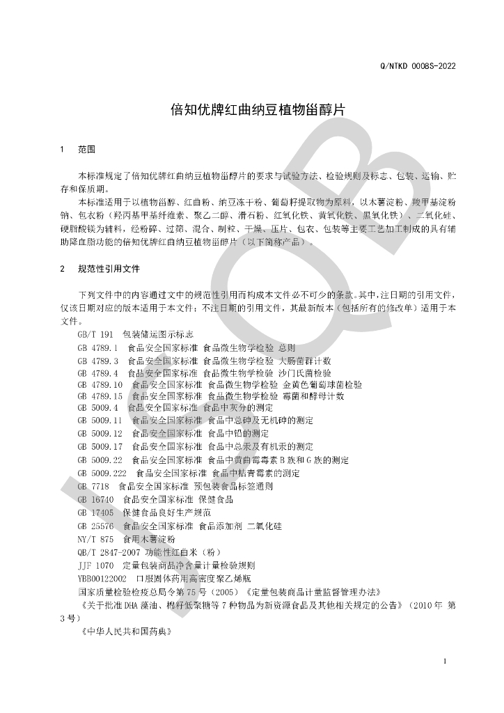 Q/NTKD 0008S-2022 倍知优牌红曲纳豆植物甾醇片