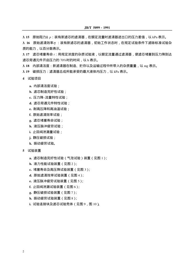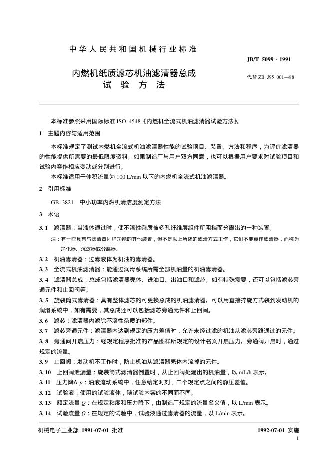 JB/T 5099-1991 内燃机纸质滤芯机油滤清器总成 试验方法
