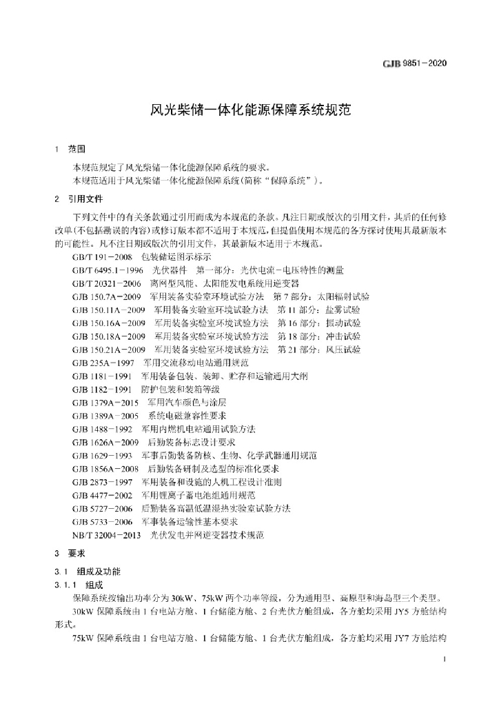 GJB 9851-2020 风光柴储一体化能源保障系统规范