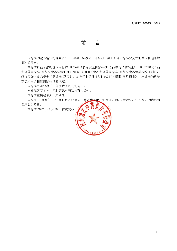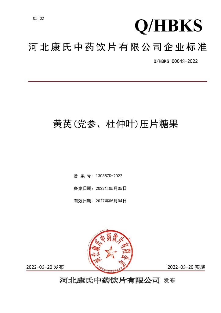 Q/HBKS 0004S-2022 黄芪(党参、杜仲叶)压片糖果