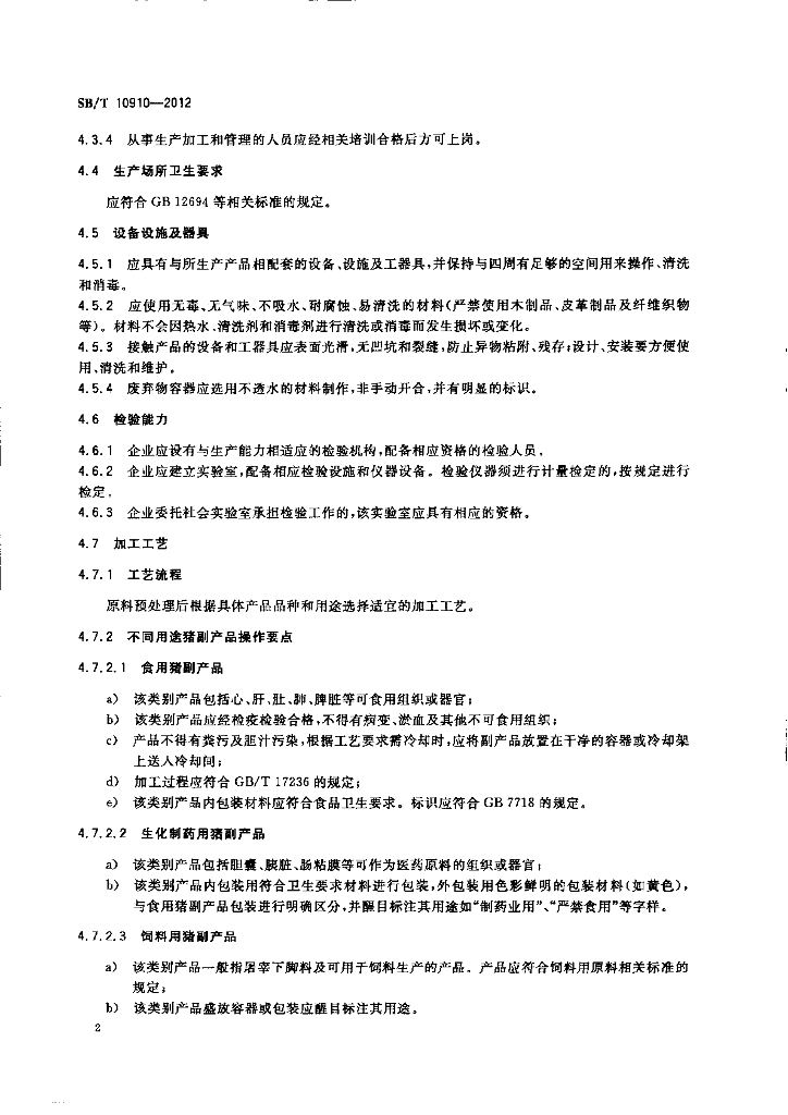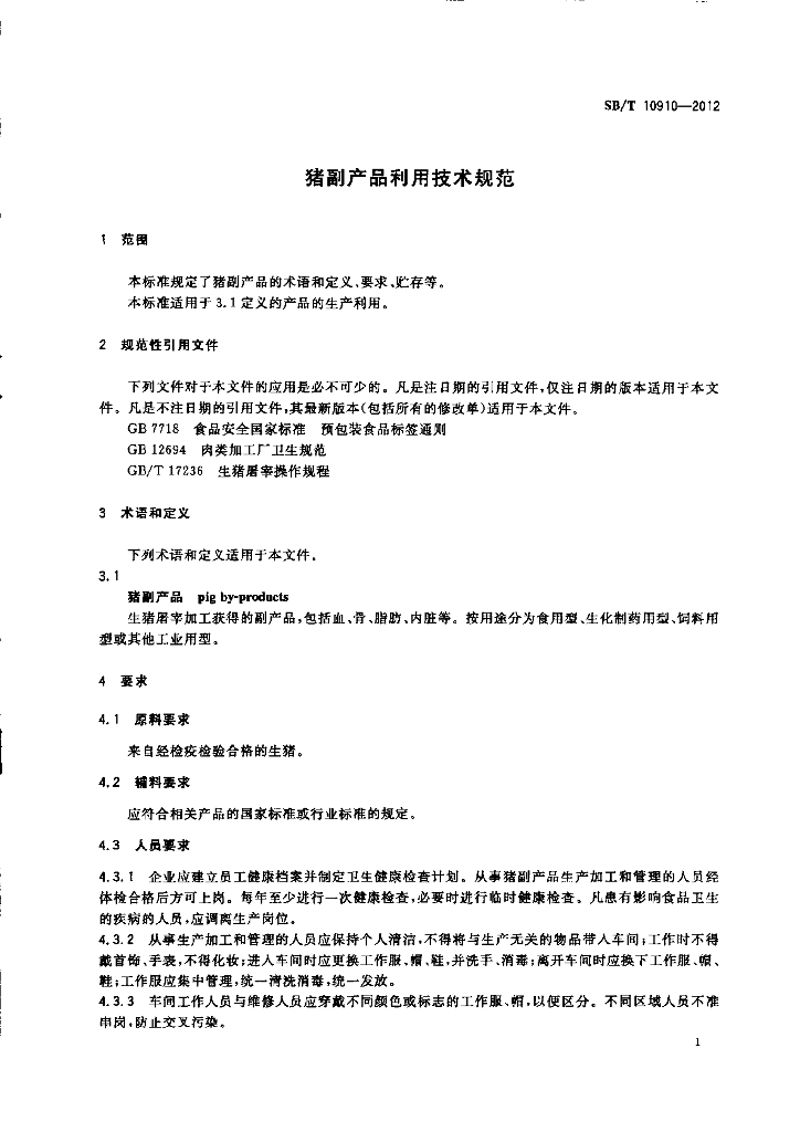 SB/T 10910-2012 猪副产品利用技术规范