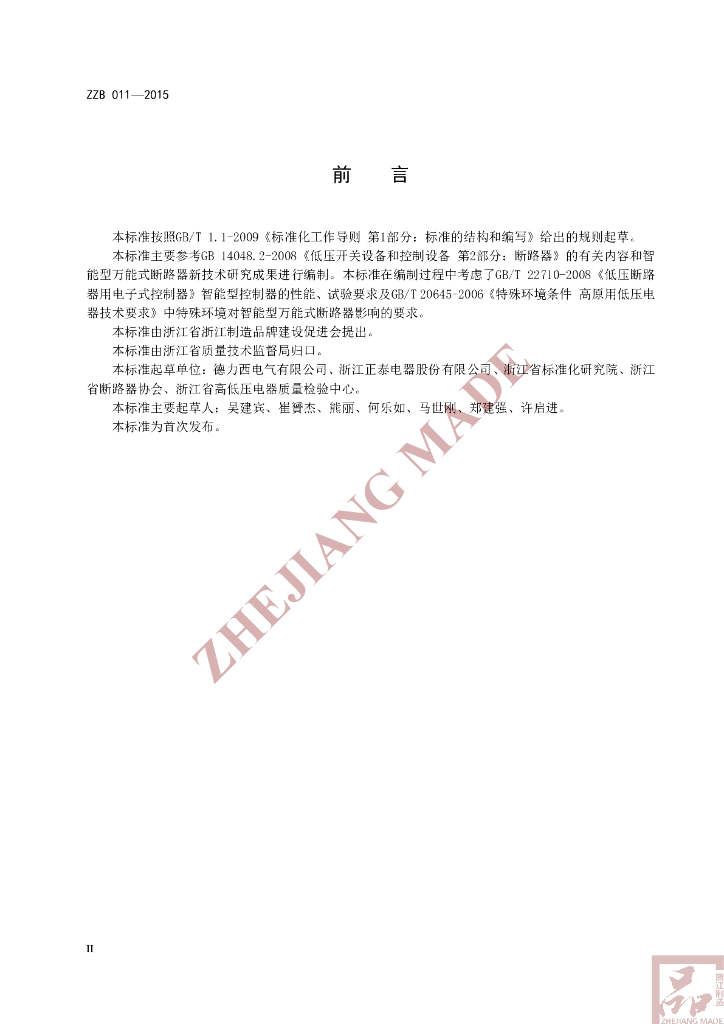 本标准起草单位:德力西电气有限公司、浙江正泰电器股份有限公司、浙江省标准化研究院、浙江省断路器协会、浙江省高低压电器质量检验中心。