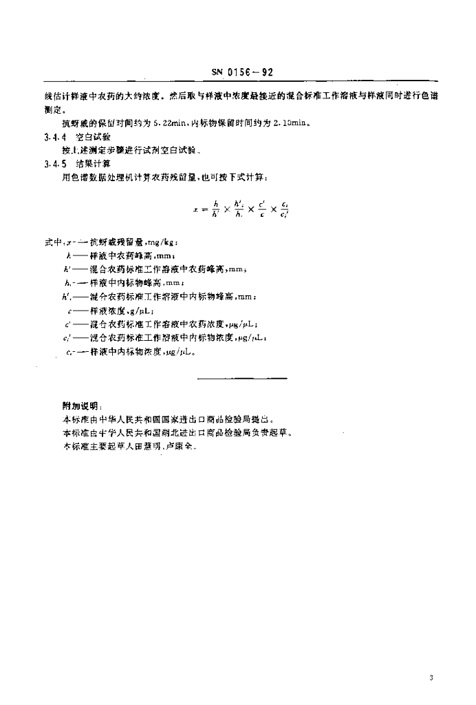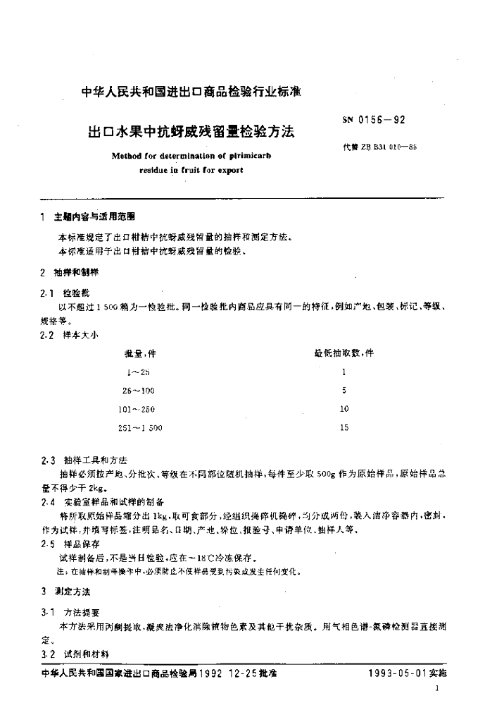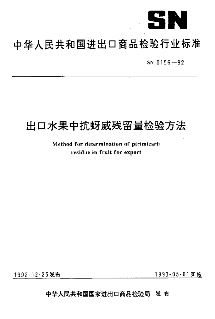 SN 0156-1992 出口水果中抗蚜威残留量检验方法