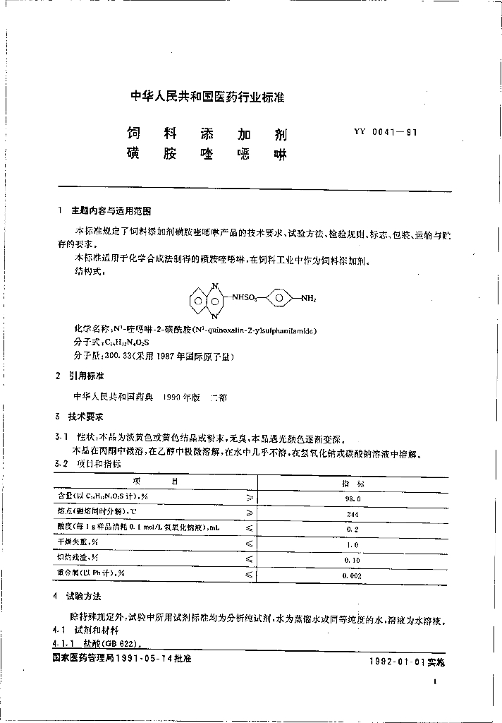 YY 0041-1991 饲料添加剂磺胺喹啉