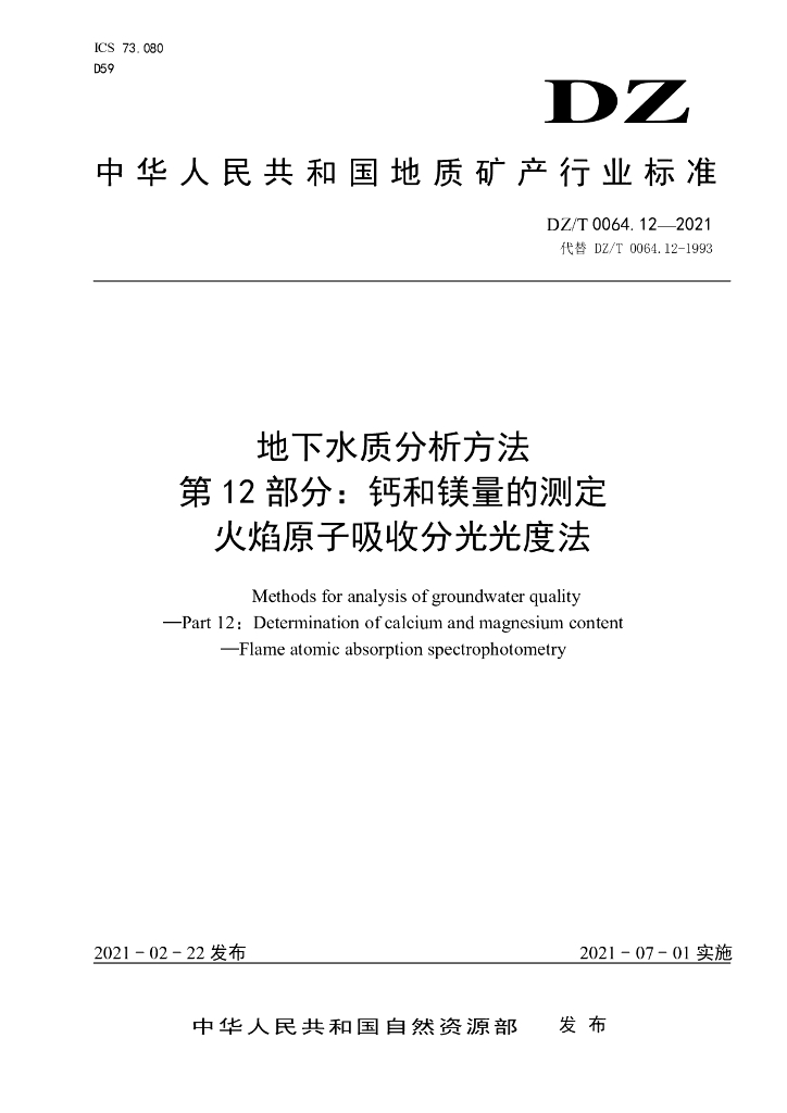 DZ/T 0064.12-2021 地下水质分析方法 第12部分:钙和镁量的测定火焰原子吸收分光光度法