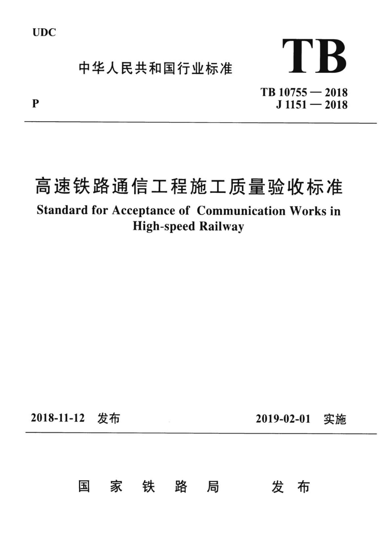 TB 10755-2018 高速铁路通信工程施工质量验收标准