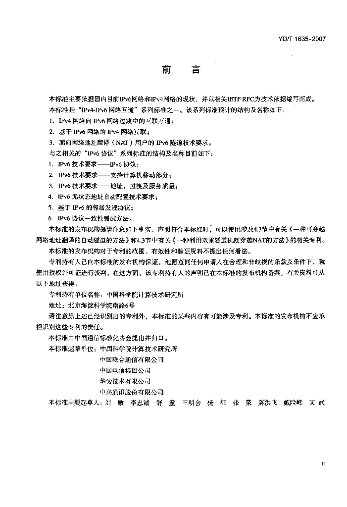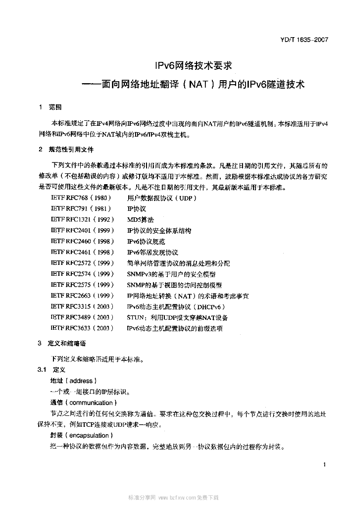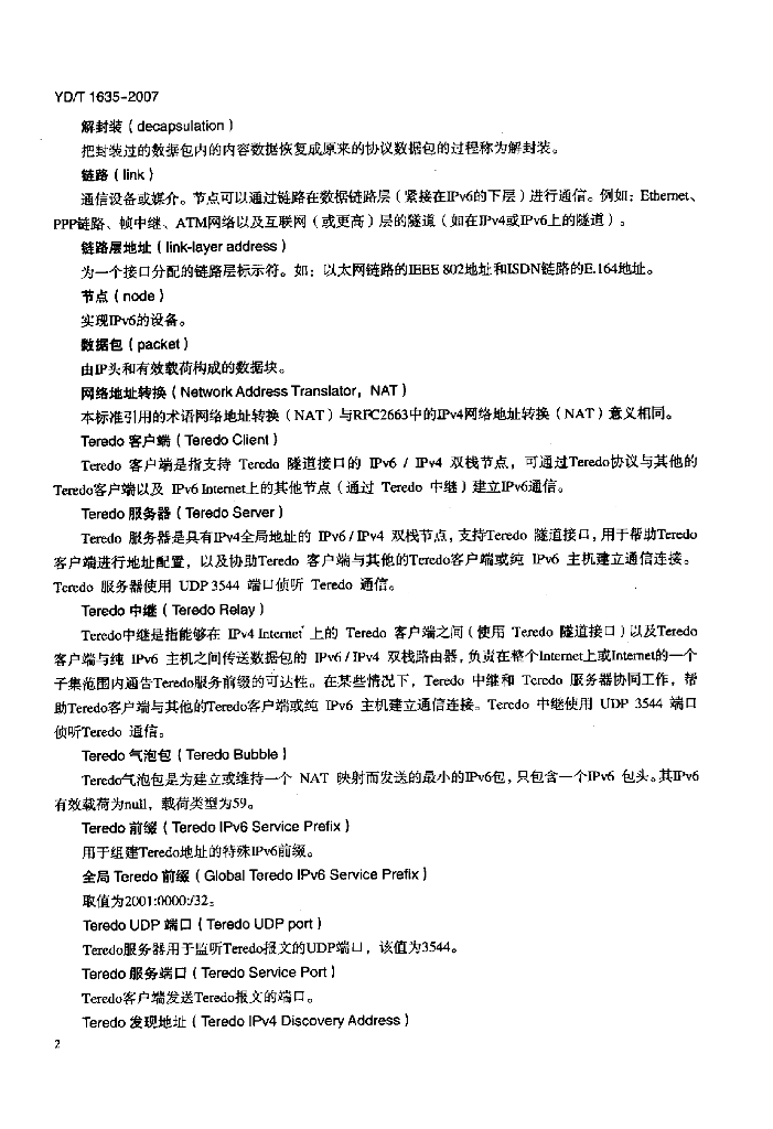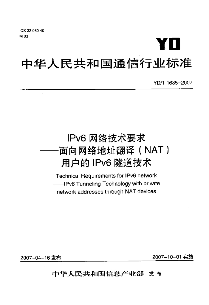 YD/T 1635-2007 IPv6 网络技术要求——面向网络地址翻译(NAT)用户的 IPv6 隧道技术