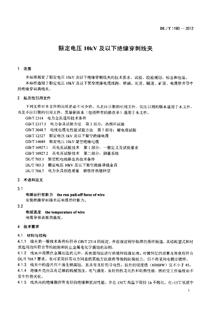 DL/T 1190-2012 额定电压10kV及以下绝缘穿刺线夹