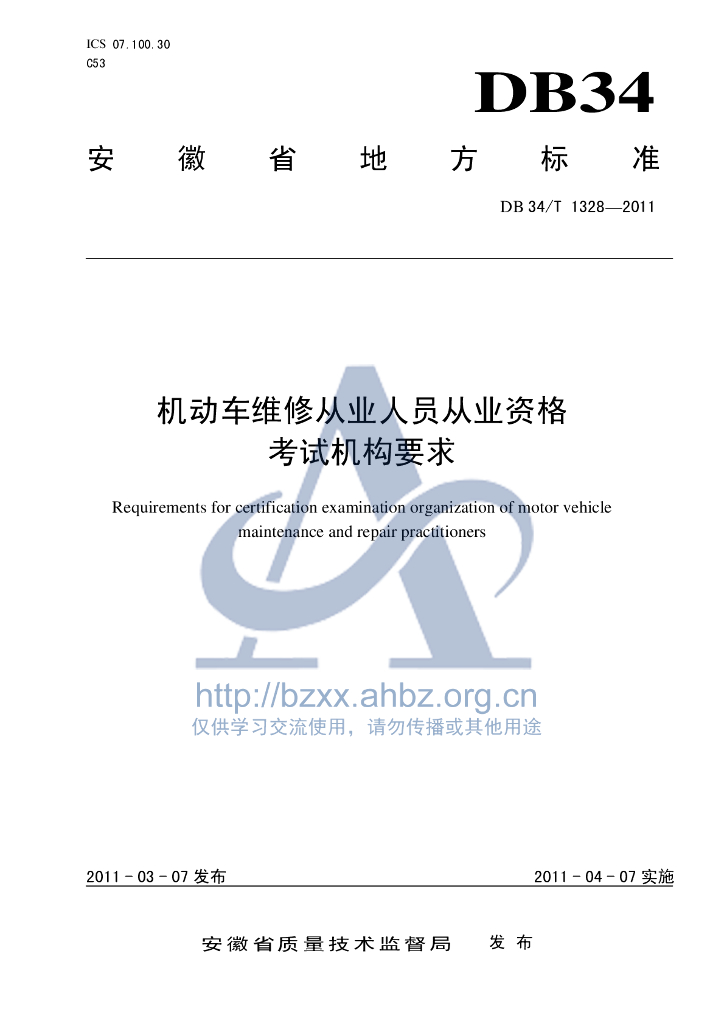 DB34/T 1328-2011 机动车维修从业人员从业资格考试机构要求