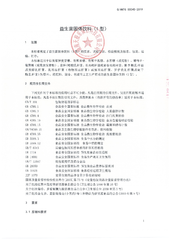 Q/ANTG 0004S-2019 益生菌固体饮料(I型)