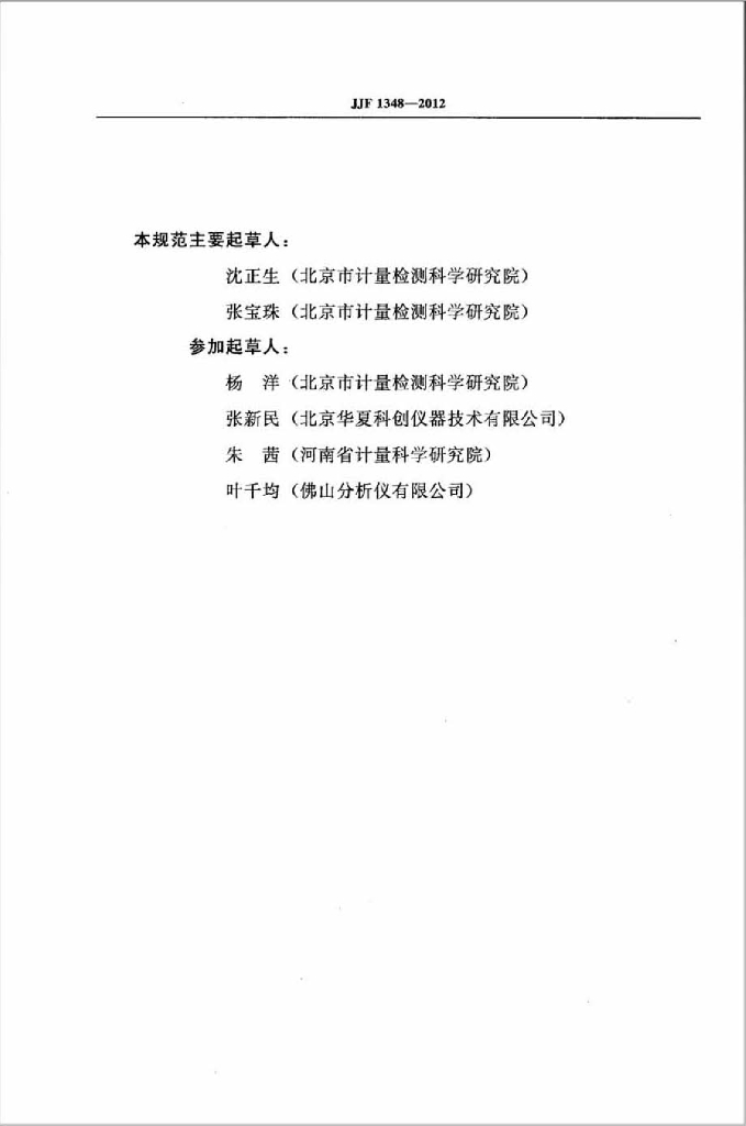 沈正生(北京市计量检测科学研究院)、张宝珠(北京市计量检测科学研究院)、杨洋(北京市计量检测科学研究院)、张新民(北京华夏科创仪器技术有限公司)、朱茜(河南省计量科学研究院)、叶千均(佛山分析仪有限公司)