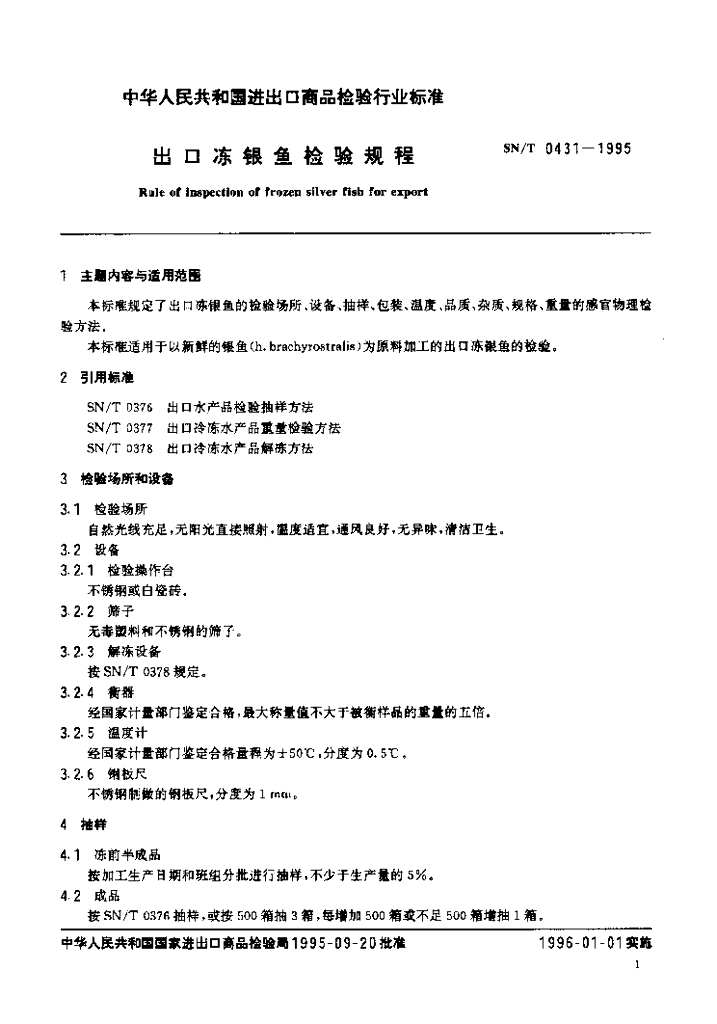 SN/T 0431-1995 出口冻银鱼检验规程