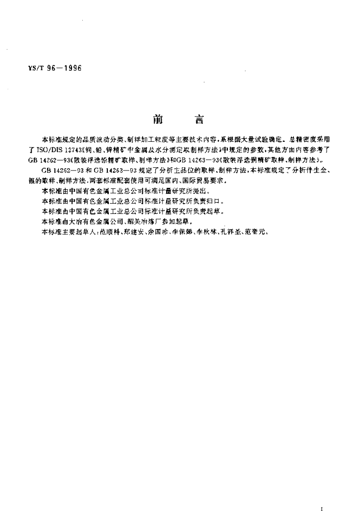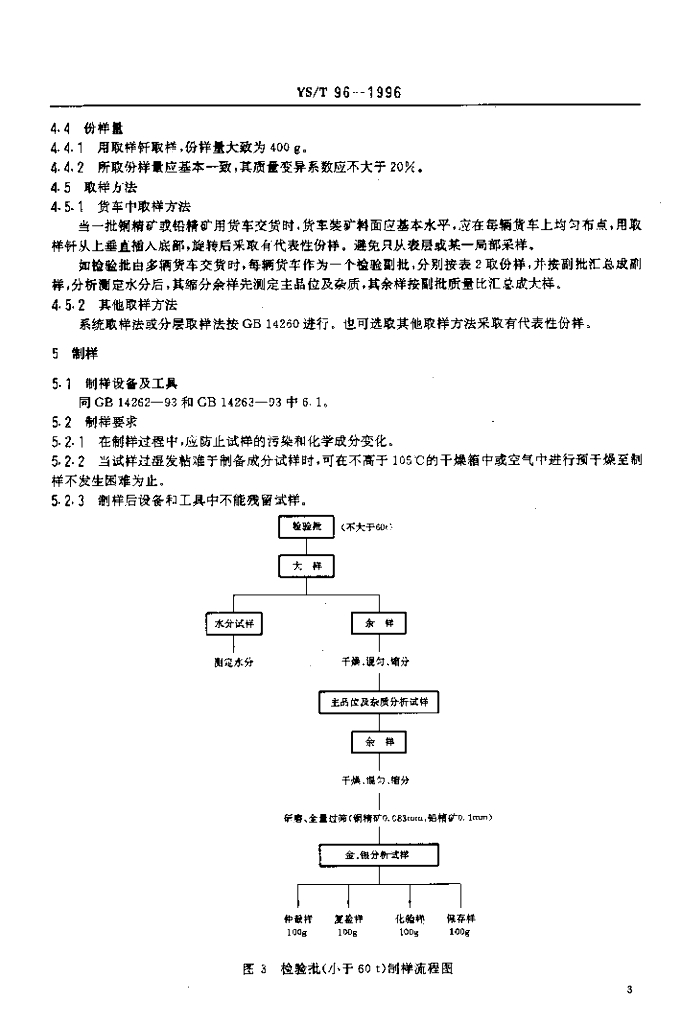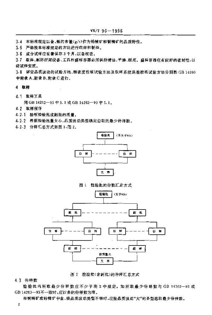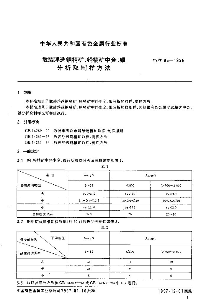 YS/T 96-1996 散装浮选铜精矿、铅精矿中金、银分析取制样方法