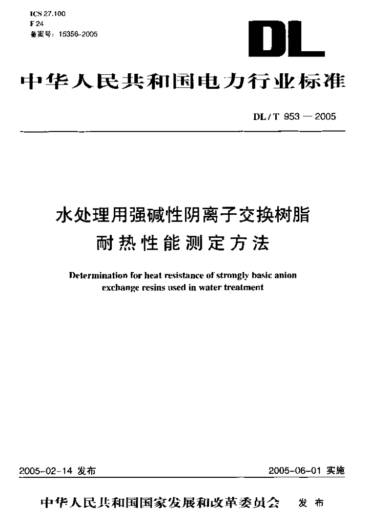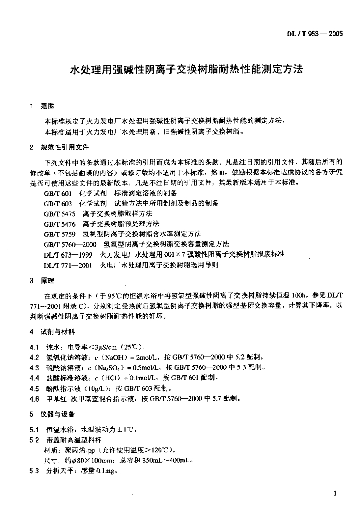 DL/T 953-2005 水处理用强碱性阴离子交换树脂耐热性能测定方法