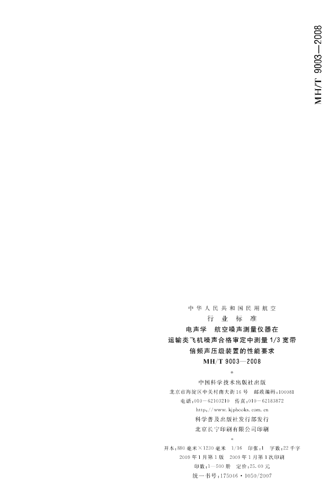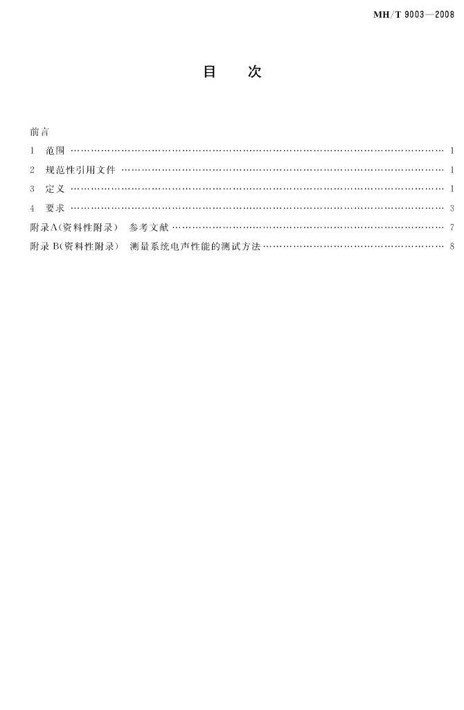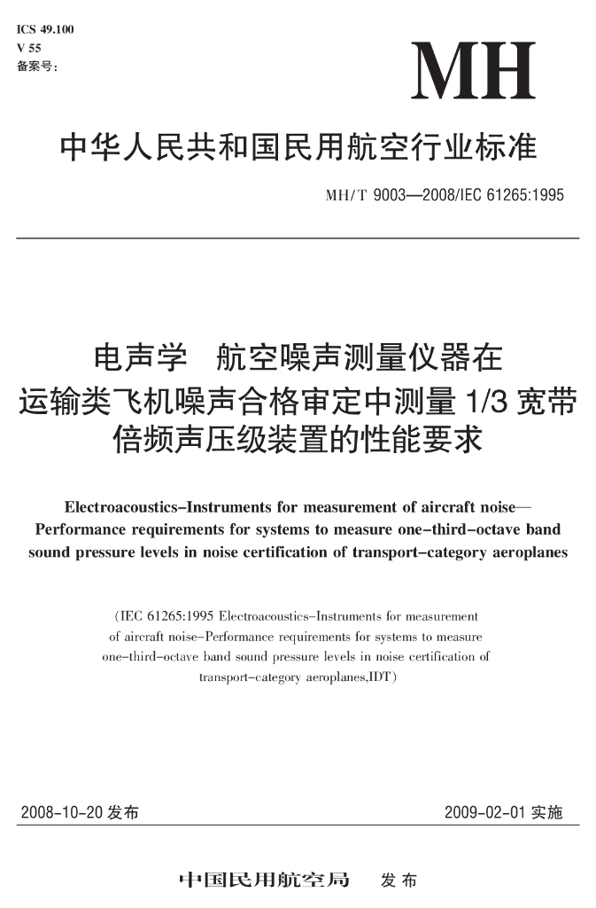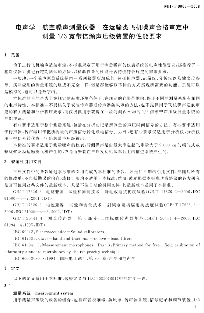 MH/T 9003-2008 电声学 航空噪声测量仪器 在运输类飞机噪声合格审定中测量1/3宽带倍频声压级装置的性能要求