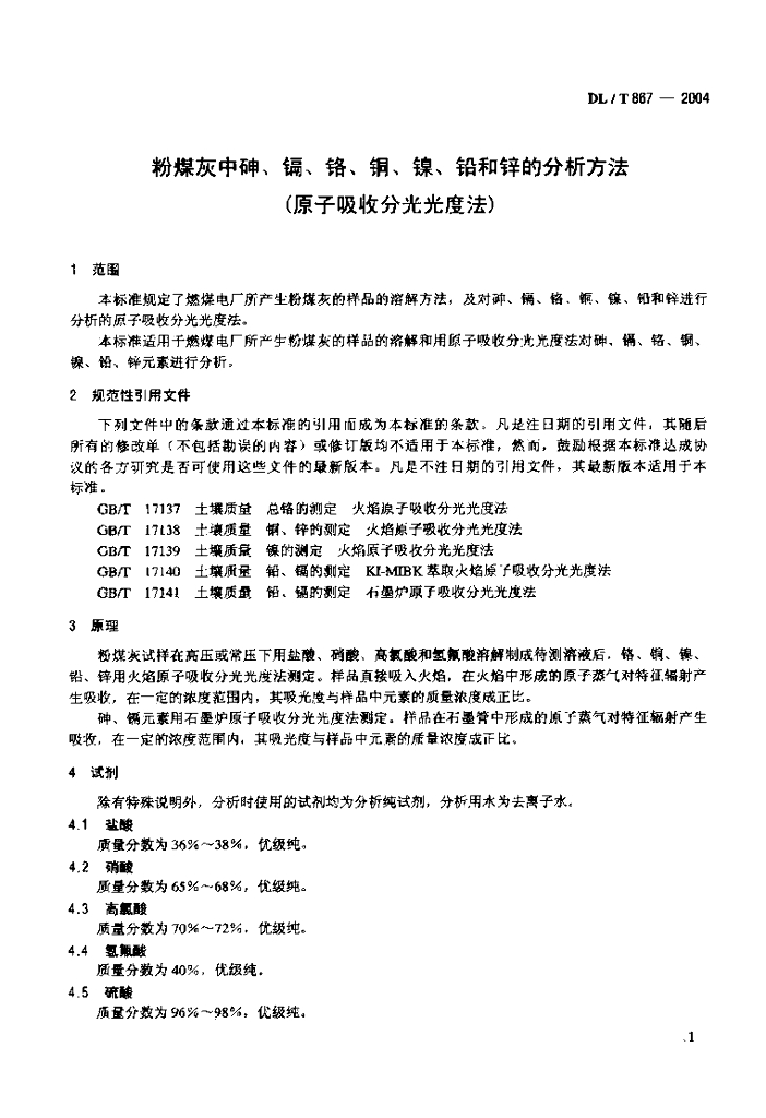 DL/T 867-2004 粉煤灰中砷 镉 铬 铜 镍 铅和锌的分析方法(原子吸收分光光度法)