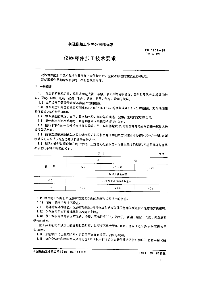 CB 1152-1986 仪器零件加工技术要求