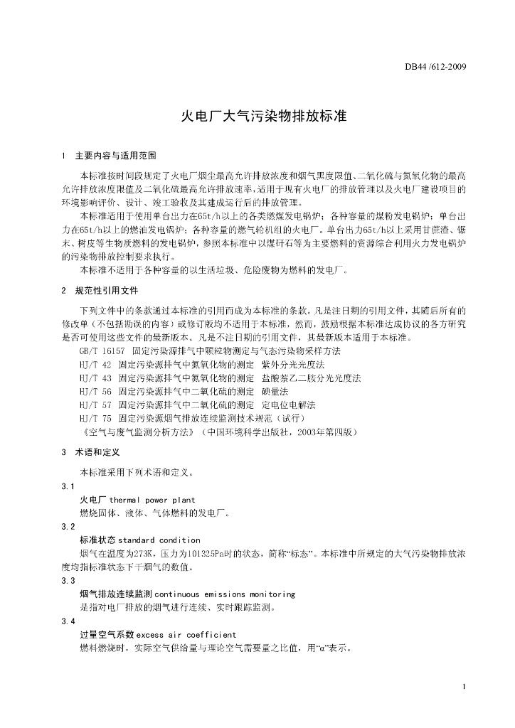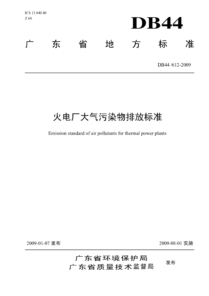 DB44/ 612-2009 火电厂大气污染物排放标准