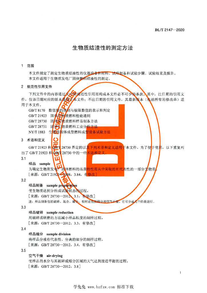 DL/T 2147-2020 生物质结渣性的测定方法