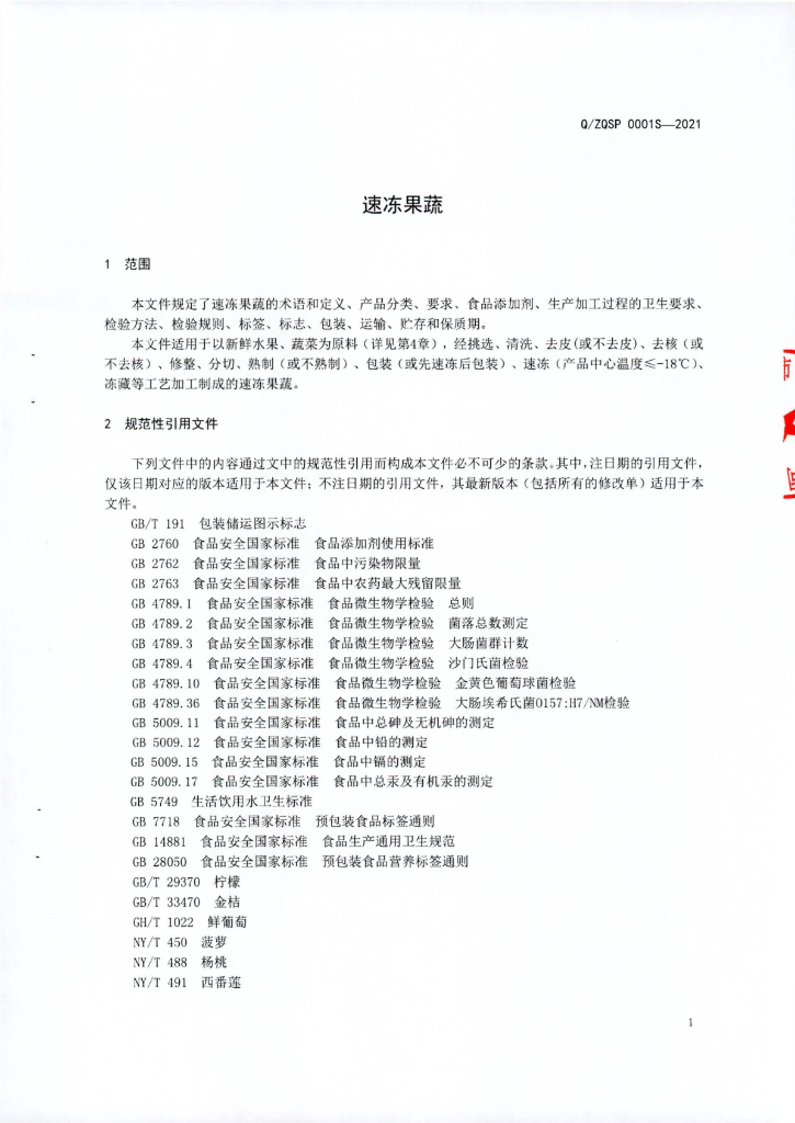 Q/ZQSP 0001S-2021 速冻果蔬