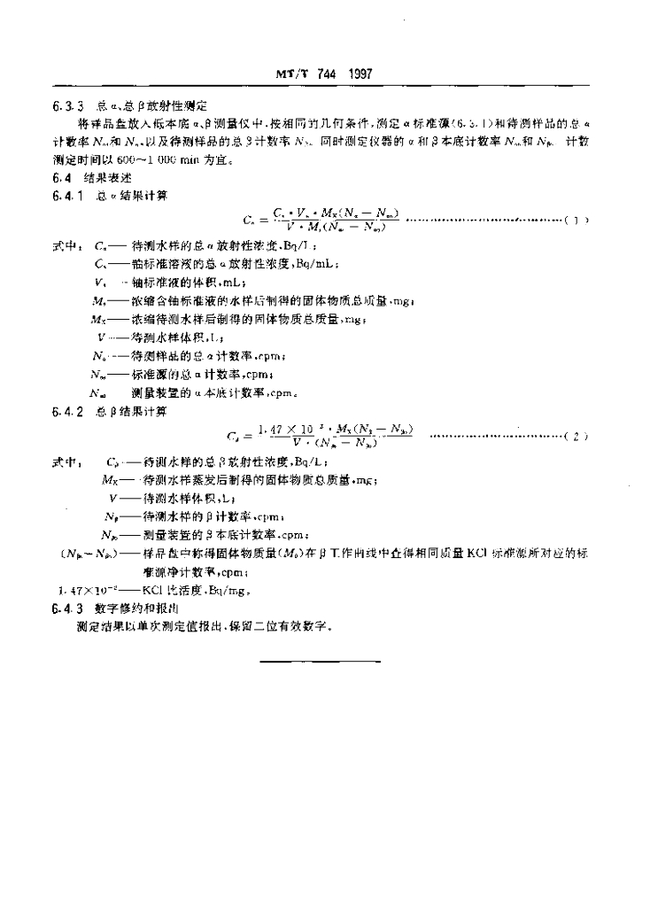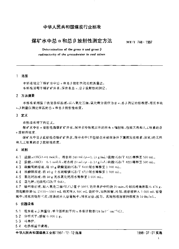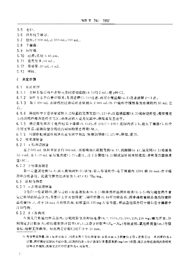 MT/T 744-1997 煤矿水中总α和总β放射性测定方法