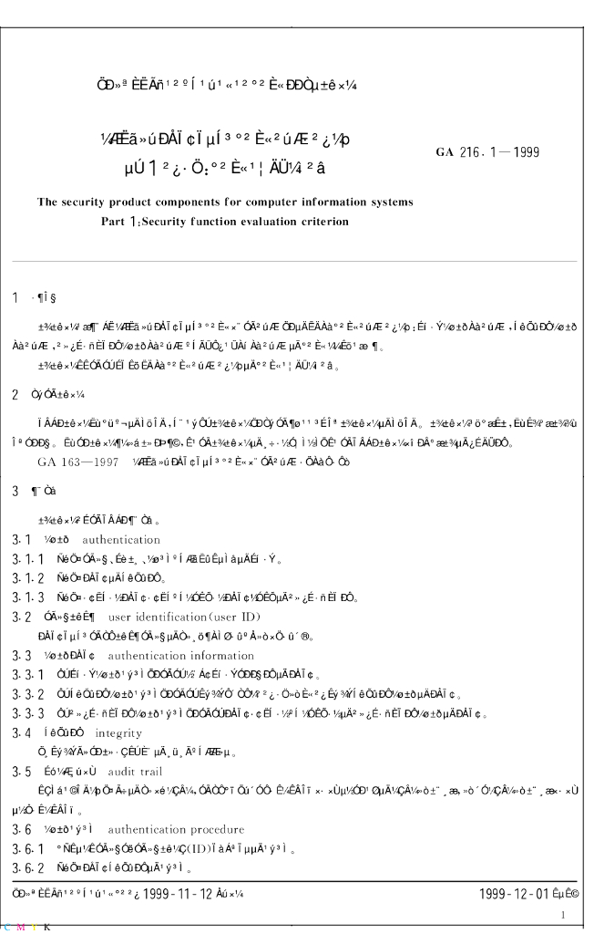 GA 216.1-1999 计算机信息系统安全产品部件 第1部分:安全功能检测