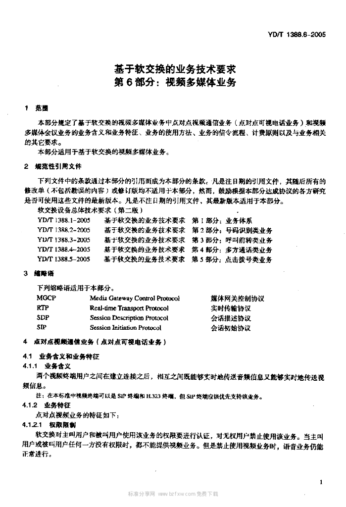 YD/T 1388.6-2005 基于软交换的业务技术要求 第6部分:视频多媒体业务