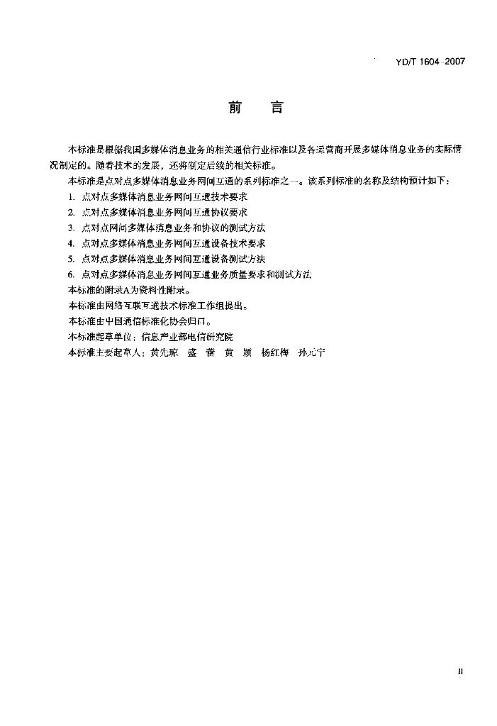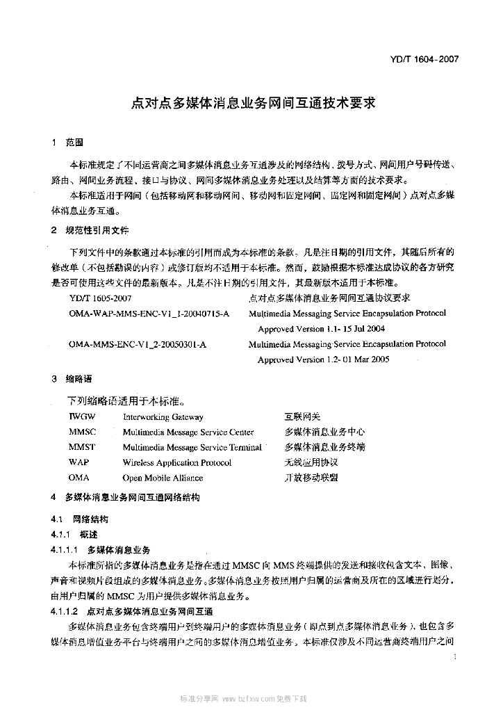 YD/T 1604-2007 点对点多媒体消息业务网间互通技术要求