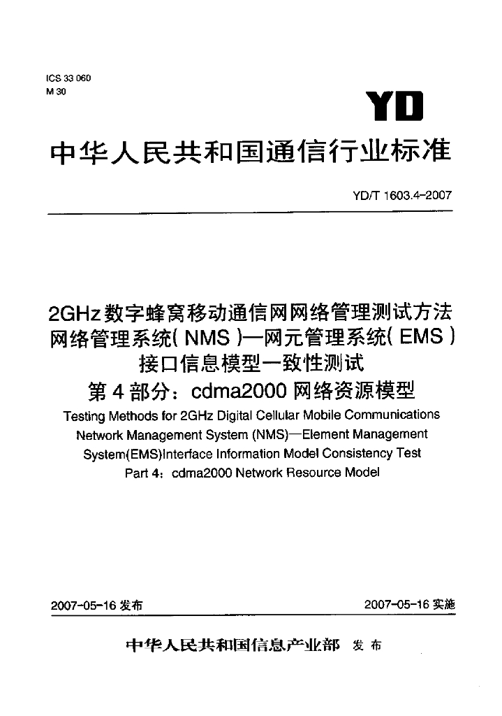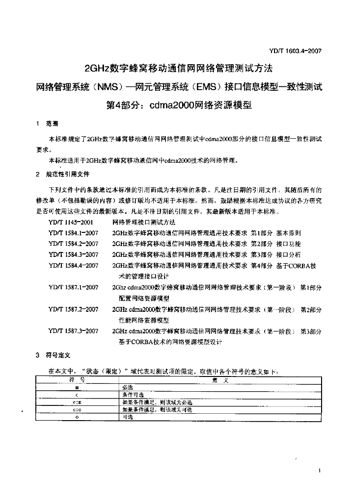 YD/T 1603.4-2007 2GHz 数字蜂窝移动通信网网络管理测试方法网络管理系统(NMS)一网元管理系统(EMS)接口信息模型一致性测试 第4部分:cdma2000 网络资源模型
