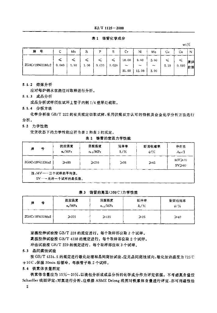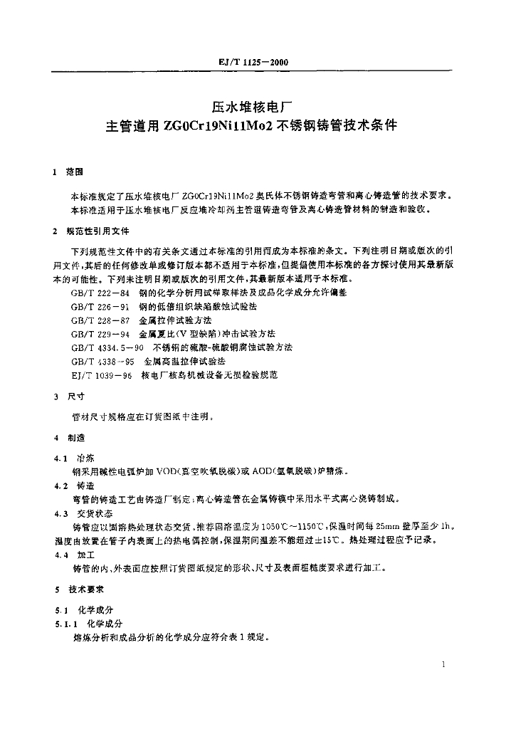 EJ/T 1125-2000 压水堆核电厂主管道用ZG0Cr19Ni11Mo2不锈钢铸钢管技术条件