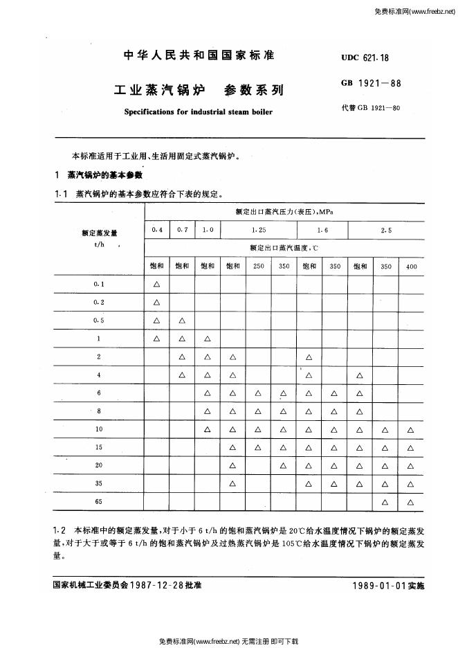 GB/T 1921-1988 工业蒸汽锅炉 参数系列