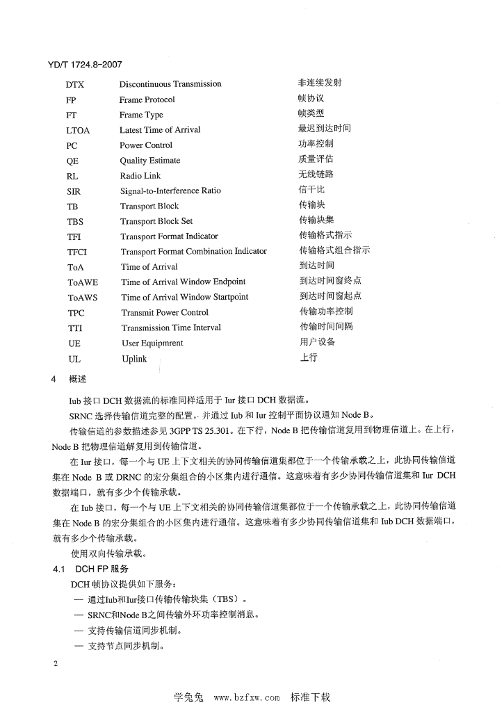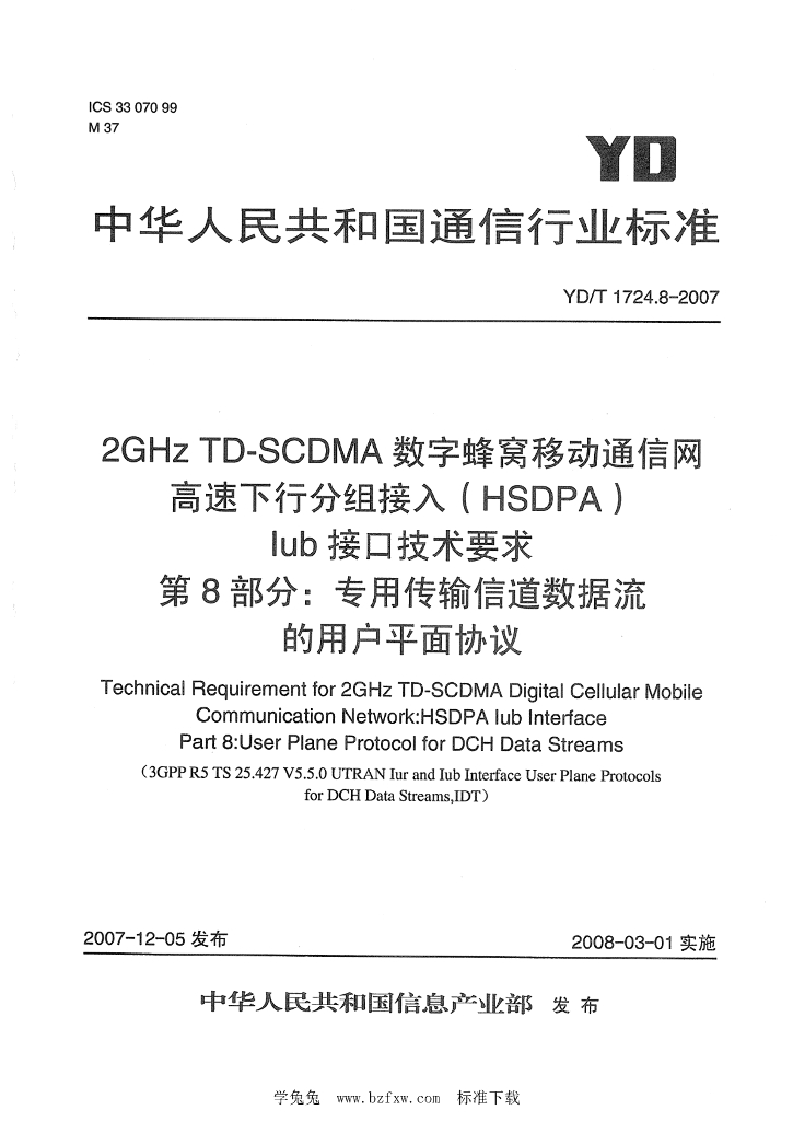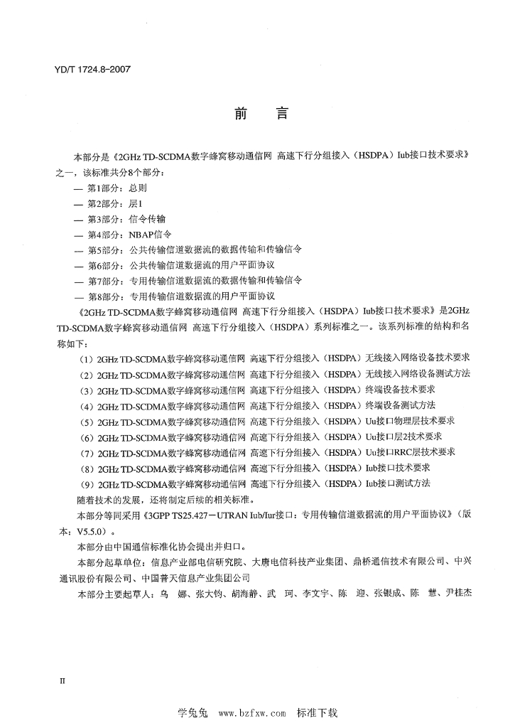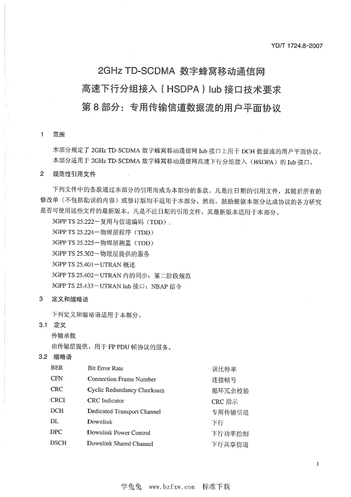 YD/T 1724.8-2007 2GHz TD-SCDMA数字蜂窝移动通信网 高速下行分组接入(HSDPA)Iub接口技术要求 第8部分:专用传输信道数据流的用户平面协议