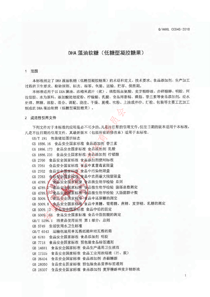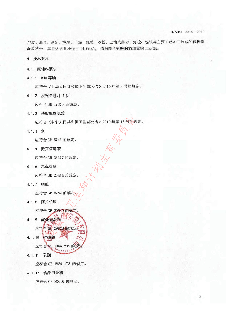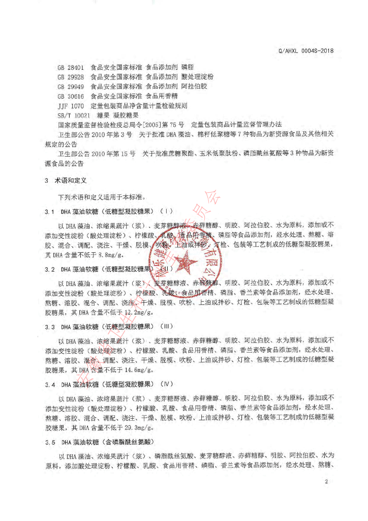 Q/AHXL 0004S-2018 DHA藻油软糖(低糖型凝胶糖果)