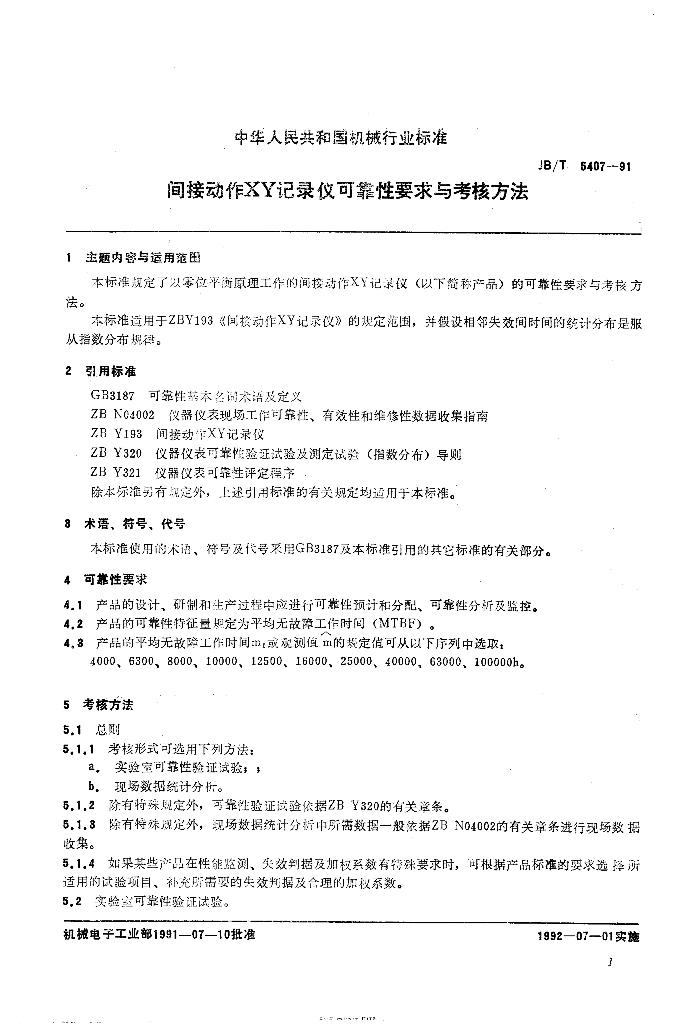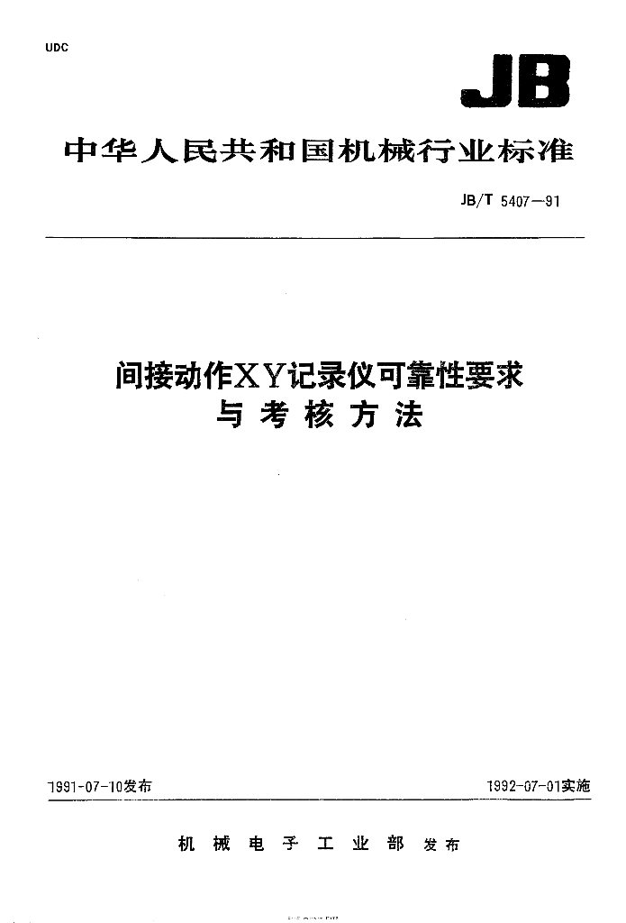 JB/T 5407-1991 间接动作XY记录仪可靠性要求与考核方法