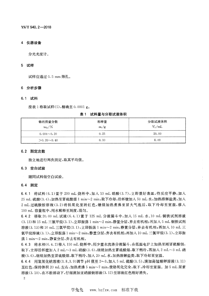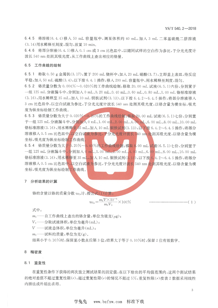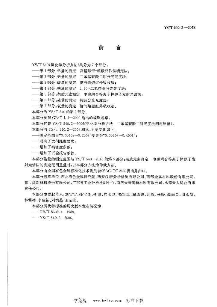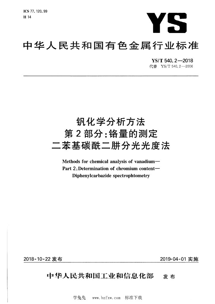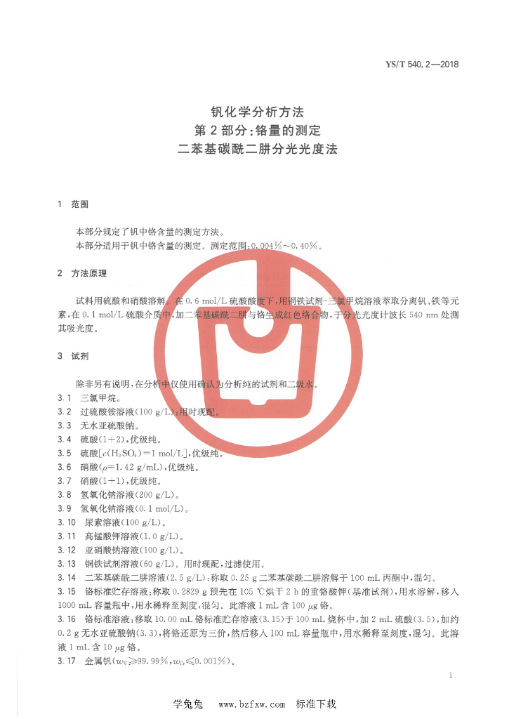 YS/T 540.2-2018 钒化学分析方法 第2部分:铬量的测定 二苯基碳酰二肼分光光度法